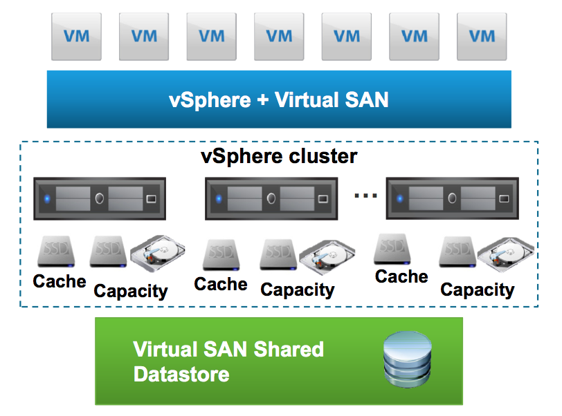 Tiên phong trong công nghệ này, không ai khác là ông hoàng VMware. Đến nay công ty đã cho ra đời version 6.2. VMware VSAN được tích hợp đầy đủ trong bộ vSphere Enterprise Plus. VMware VSAN tập hợp tất cả những local disk group trên tất cả các ESXi host vào trong vShpere cluster và tạo ra 1 resource pool, sau đó chia cho tất cả host trong cluster